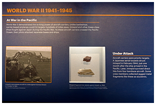 Di sicuro interesse la ricostruzione storica mediante filmati d'epoca e effetti speciali di luci e fumi che circa ogni ora illustra, nel punto della nave in cui realmente accaddero, i fatti che portarono l'unità ad essere colpita nel Mare delle Filipppine da due velivoli kamikaze giapponesi il 25 Novembre del 1944, con la perdita di 69 militari imbarcati sulla nave. |