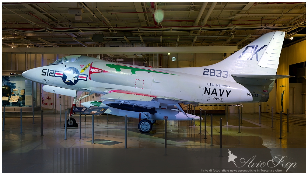 In questa ottica è molto interessante la presenza di un raro Piasecki HUP-2 Retriever, piccolo elicottero utility birotore, talmente piccolo da poter utilizzare gli ascensori della portaerei senza necessità di ripiegare le pale, che ha operato dalla nave negli anni che vanno dal 1954 al 1961, mentre la presenza di un bellissimo Douglas A-4B nei colori del VA-95, compatto cacciabombardiere che ha accompagnato con il conflitto vietnamita l'ultimo periodo operativo della Intrepid, giustamente chiude il percorso espositivo sottocoperta. |