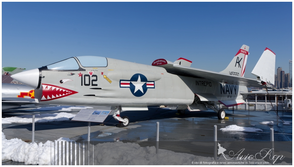 Altro modello non molto comune in esposizione sul ponte principale è uno splendido Chance-Vought F-8K "Crusader", che veste la livrea del velivolo del Tenente Tony Nargi, pilota del VF-111 della US Navy distaccato sulla Intrepid, che il 19 Settembre 1968 abbatté con un missile Sidewinder un Mig-21 nordvietnamita. |
