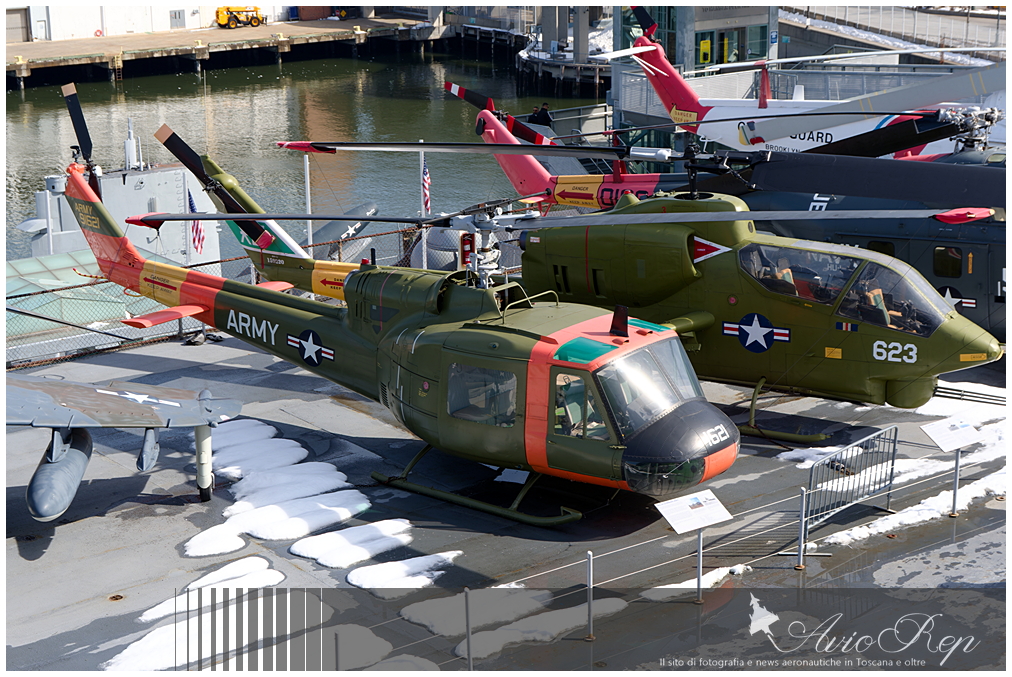 Il Bell UH-1A, uno dei 182 esemplari di questa prima versione delle "Huey", ripreso dall'isola di comando della Intrepid; e' visibile in secondo piano il Bell AH-1J "Sea Cobra" dei Marines