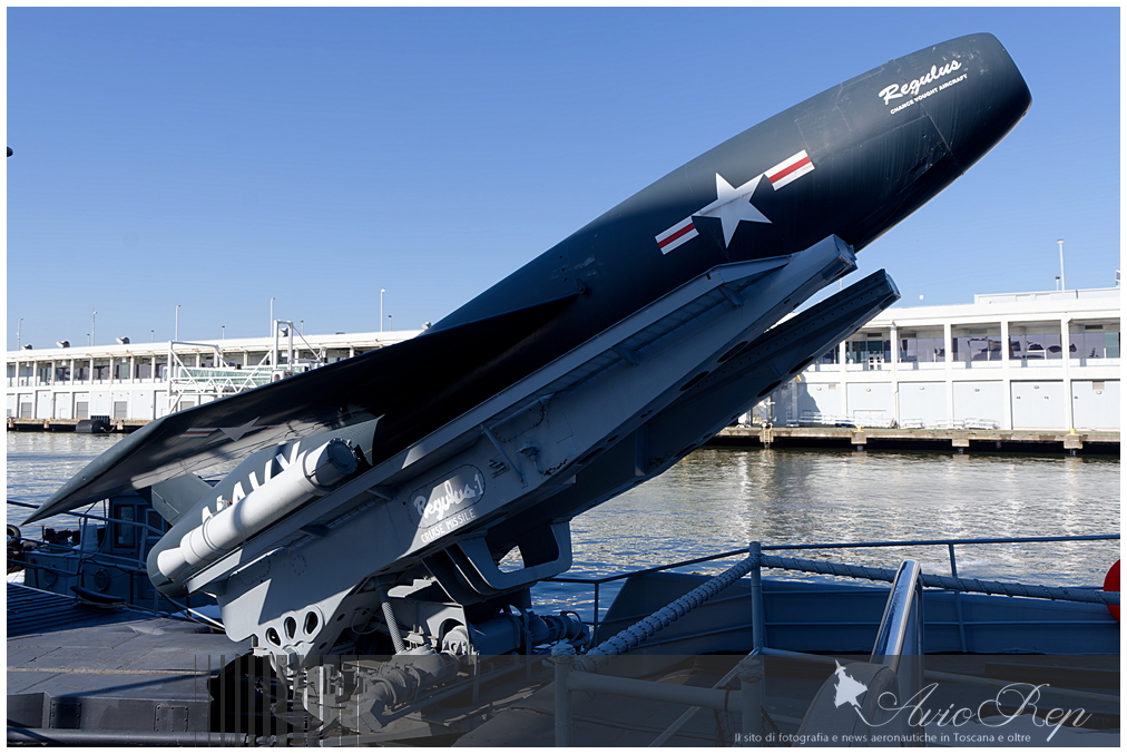 Un missile subsonico radioguidato Chance-Vought RGM-6 "Regulus" sul ponte del sommergibile SSG-577 "Growler", che poteva ospitarne fino a quattro; erano pensati come deterrente strategico nucleare durante la "Guerra Fredda", ma furono ben presto sostituiti dai missili balistici "Polaris"