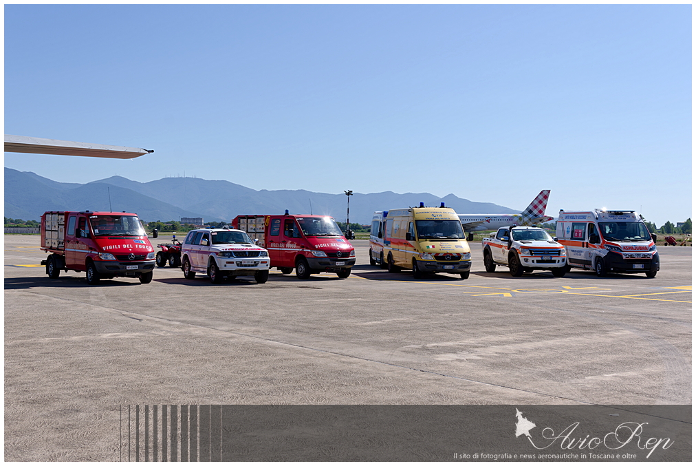 Schieramento di mezzi di Vigili del Fuoco e Croce Rossa che normalmente lavorano in sinergia con la 46ma Brigata Aerea in occasione di emergenze e calamita'