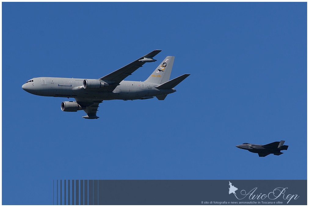 Il passaggio di uno dei KC-767A in dotazione al 14° Stormo dell'Aeronautica, seguito, a simulare la manovra di rifornimento in volo, da un F-35A del 32° Stormo
