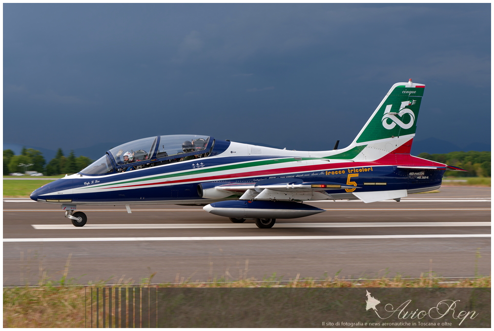 Come gia' accadde cinque anni fa, per il 60° Anniversario della Pattuglia, e piu'recentemente in occasione del Centenario dell'Aeronautica Militare, le derive delle "Frecce" sono state personalizzate per l'evento, quelle dei gregari colorate in verde o rosso, in grigio chiaro le altre