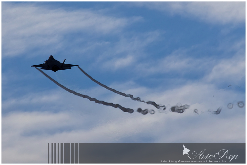 Il passaggio veloce con le caratteristiche scie di condensazione alare sulla pista di Istrana di un F-35 del 6° Stormo di Ghedi, reparto che ha preso parte dalla propria base alla Poggio Dart 2025